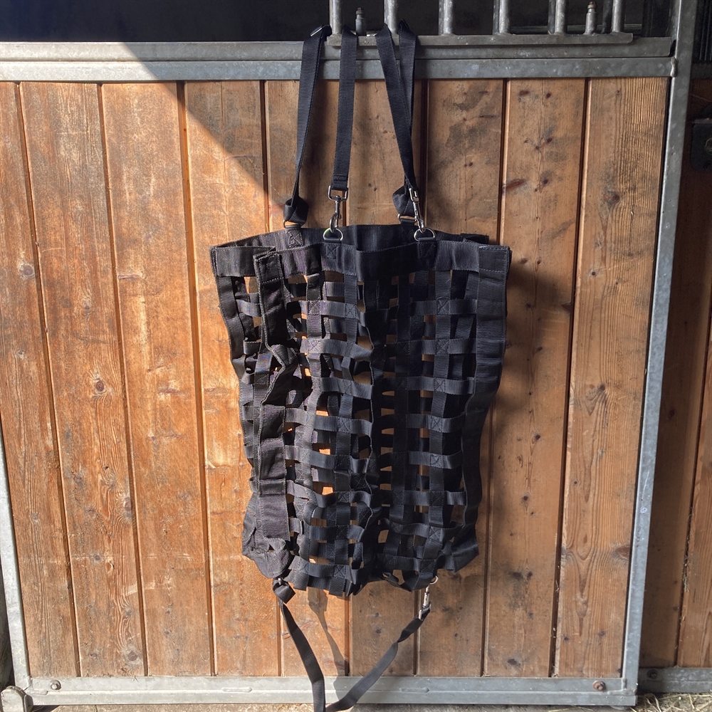De hooi tas is gemakkelijk op te hangen op de meeste plaatsen met 2 karabijnhaken.