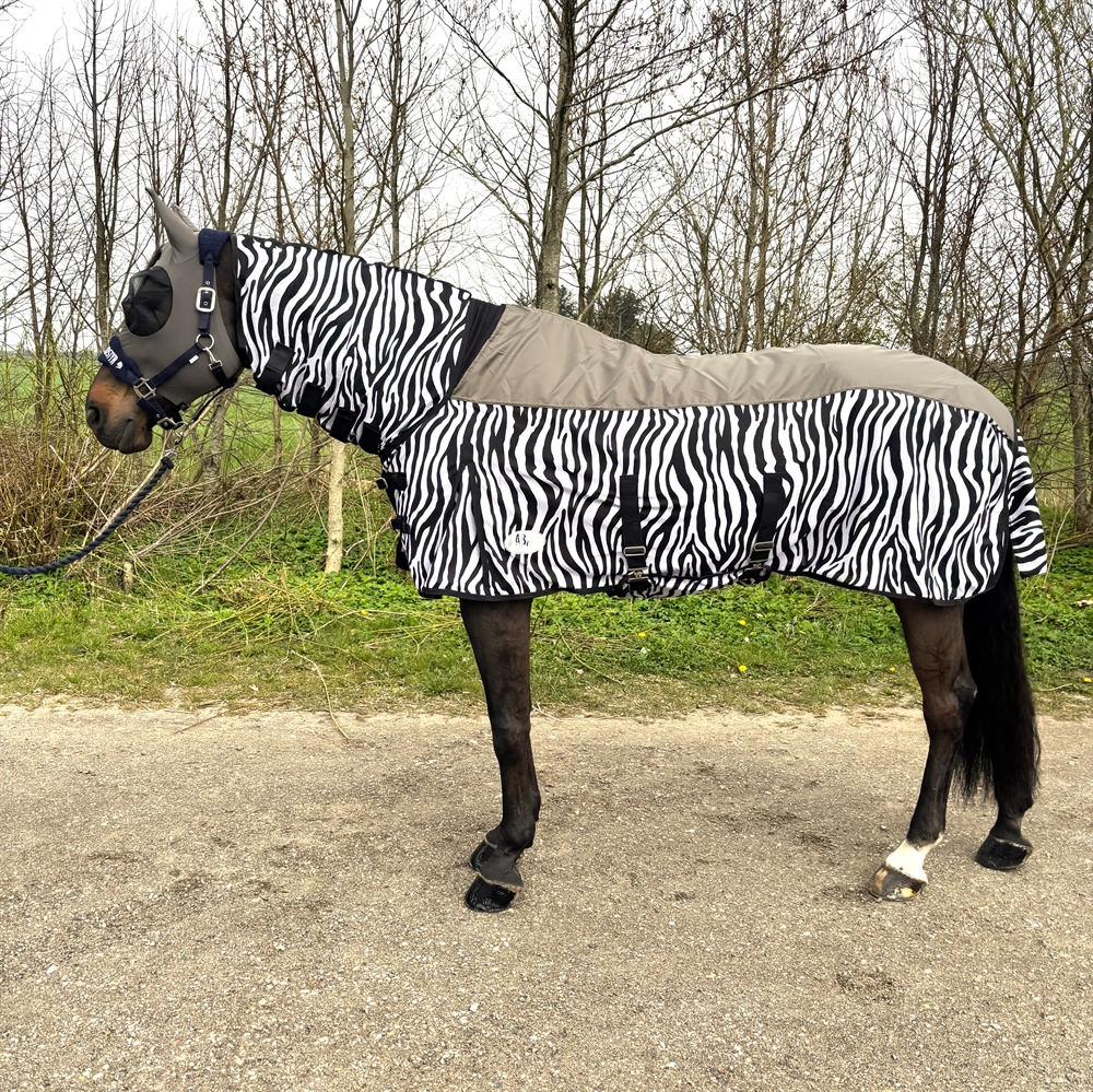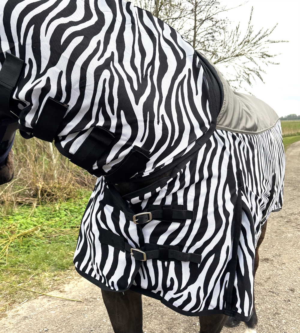 De zebradeken is een effectieve insectendeken uitgerust met buikflap en goede verstelbaarheid in de singels evenals verstelbare bilkoorden en staartflap.