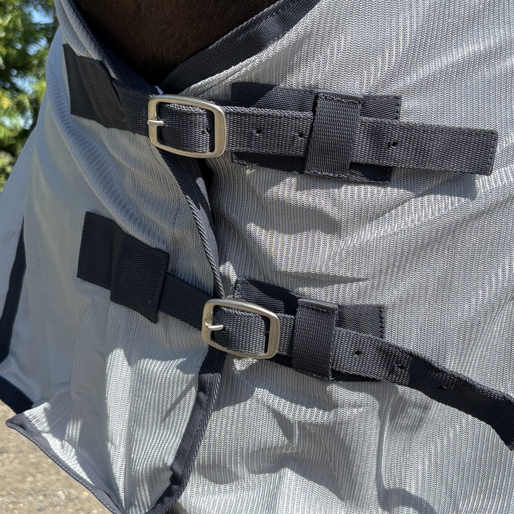 De vliegendeken is voorzien van nylon bij de borst voor meer comfort en ter voorkoming van slijtage, evenals een dubbele sluiting. De deken heeft bilkoorden, een staartflap en een buikflap met verstelbare singels.