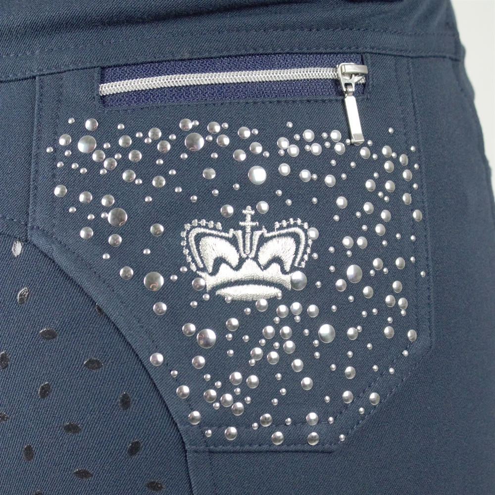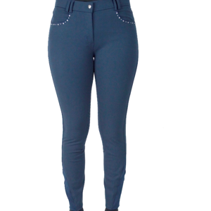 De broek heeft jeanszakken aan de voorkant met een met klinknagels versierde rand, twee achterzakken met ritssluiting en klinknageldecoratie op één achterzak.