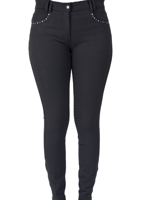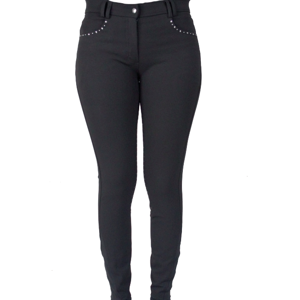 De broek heeft jeanszakken aan de voorkant met een met klinknagels versierde rand, twee achterzakken met ritssluiting en klinknageldecoratie op één achterzak.