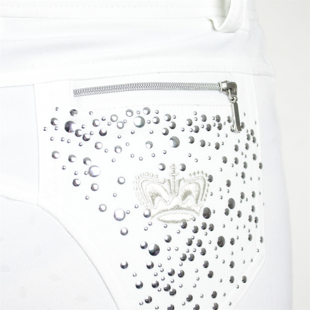 De broek heeft jeanszakken aan de voorkant met een met klinknagels versierde rand, twee achterzakken met ritssluiting en klinknageldecoratie op één achterzak.