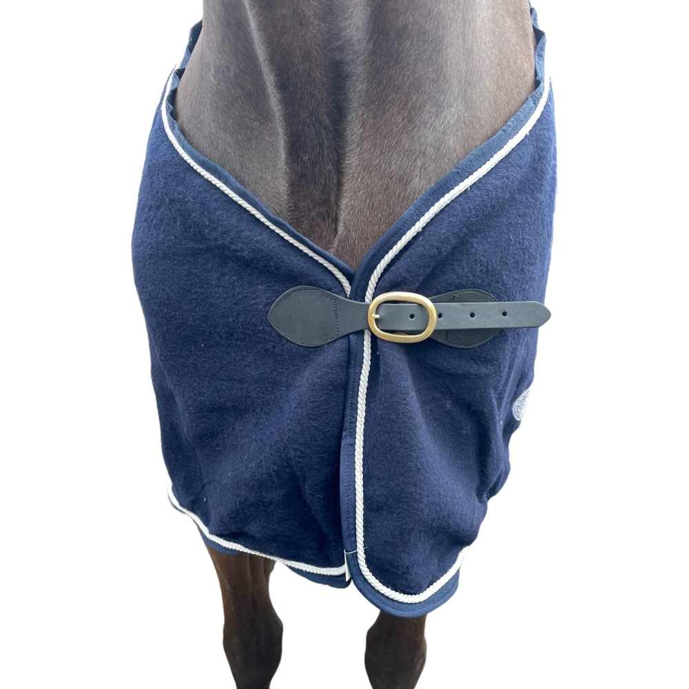 Het sluit gemakkelijk met een eenvoudige leren voorsluiting, die zowel praktisch als elegant is, en het is uitgerust met een staartkoord om het deken op zijn plaats te houden.