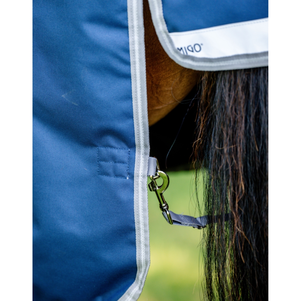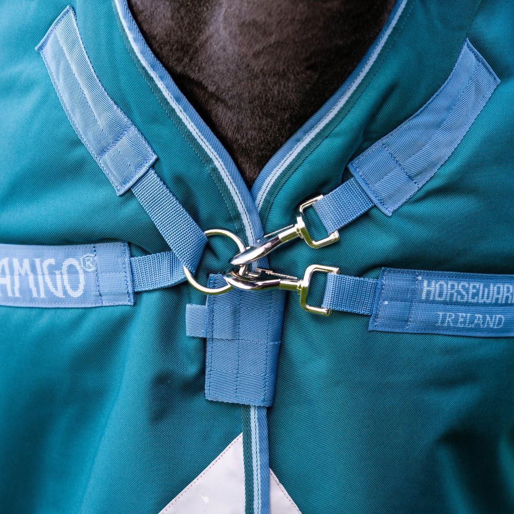 Duurzaam Amigo Bravo regendeken met halve hoge hals, die een andere en meer aansluitende pasvorm biedt – bijzonder geschikt voor smalle paarden. De verhoogde hals draagt bij aan een betere pasvorm en vermindert het risico dat de deken naar achteren glijdt.