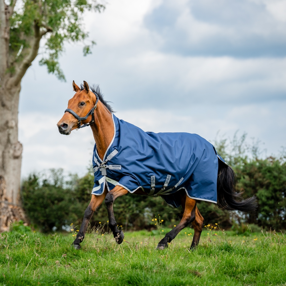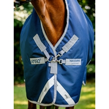 De deken is gemaakt van 1200 denier speciaal geweven nylon, dat zowel waterdicht als ademend is en zorgt voor effectieve bescherming tegen regen en wind. V-voorsluiting verdeelt de druk gelijkmatig over de schouders en biedt meer vrijheid voor hals en voorhand. De loopsplitten zorgen voor optimale bewegingsvrijheid.