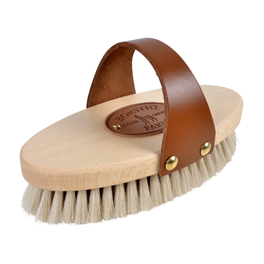 De borstel heeft een riem over de handrug en is geschikt voor paarden met een korte vacht en om het laatste fijne stof te verwijderen.