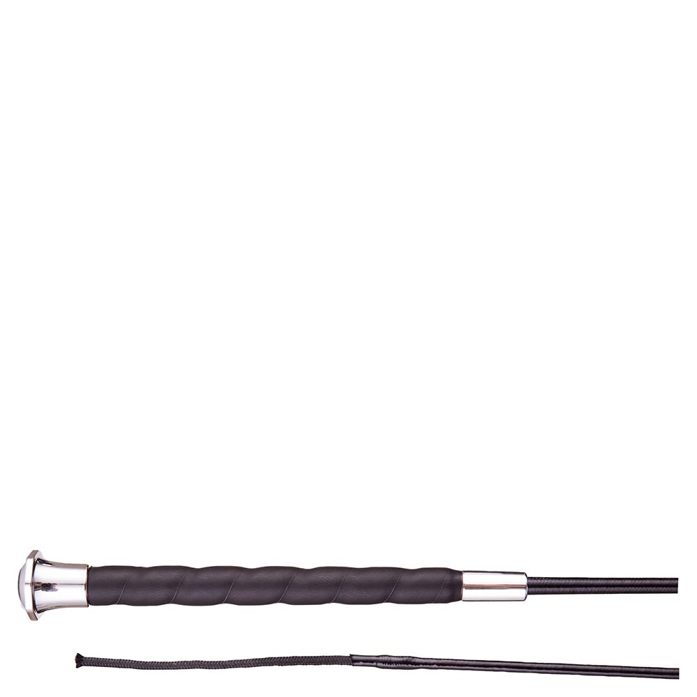 Handige rijzweep van glasvezel met omwikkeld nylondraad en een mooi antislip leren handvat.
