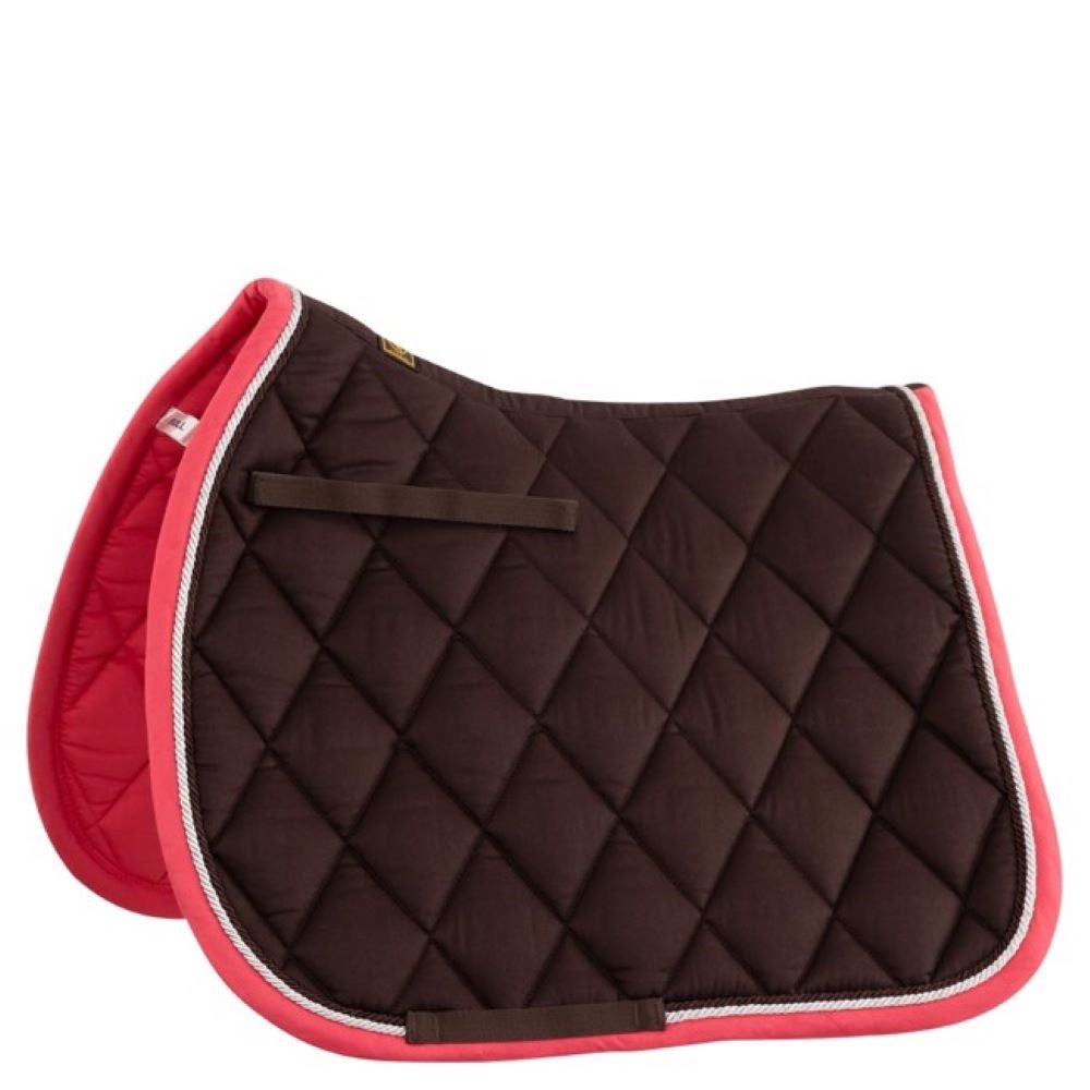 De onderlegger is versierd met één of twee biezen en heeft een verstelbare zadelriem met klittenbandsluiting.