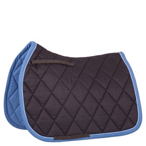 De onderlegger is versierd met één of twee biezen en heeft een verstelbare zadelriem met klittenbandsluiting.