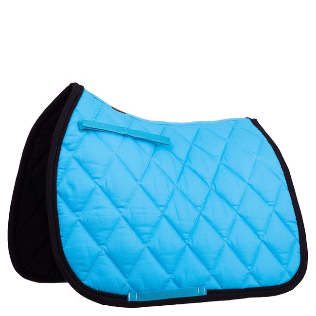 De onderlegger is versierd met een of twee biezen en bevat een verstelbare zadelriem met klittenbandsluiting.