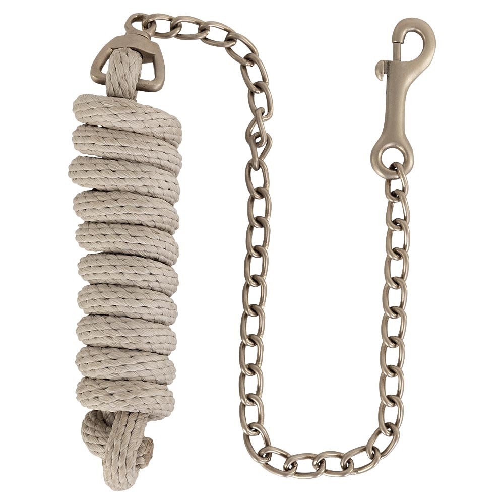 Het leidtouw is gemaakt van slijtvast polypropyleen en heeft een lengte van 2,5 meter. De stevige ketting is voorzien van een praktische musketonhaak, waarmee je hem eenvoudig aan het halster bevestigt.