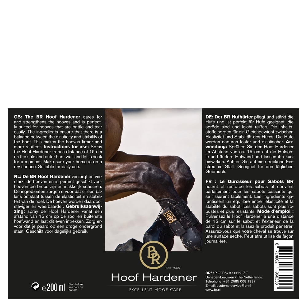 BR Hoof Hardener verzorgt en versterkt de hoeven en is perfect geschikt voor hoeven die poreus zijn en gemakkelijk scheuren.