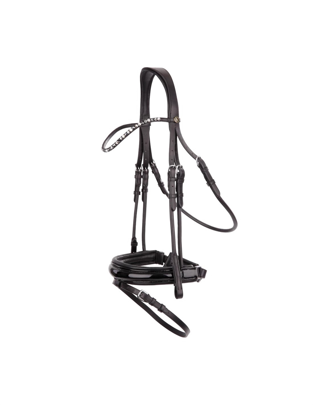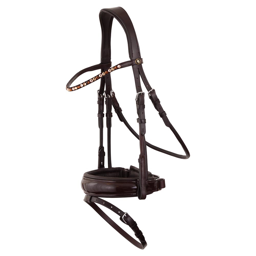 Het licht gebogen frontriem met Swarovski-stenen in verschillende kleuren voegt een luxueuze uitstraling toe, terwijl de brede neusriem een glanzende lakafwerking en zachte voering heeft voor optimale drukverdeling.