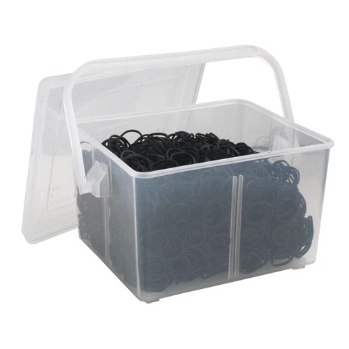 Handige kleine opbergdoos met ca. 2.500 manenelastieken.
