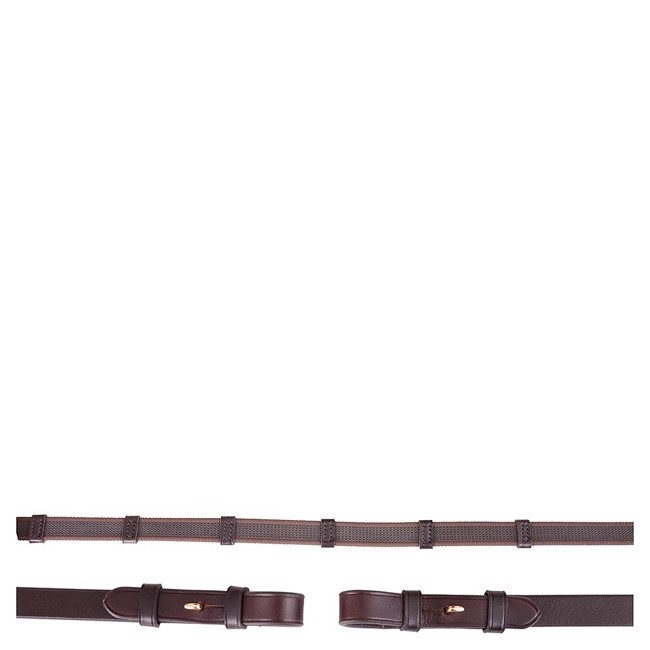De teugel heeft zowel handstops als teugelstops, die helpen bij de correcte handplaatsing en zorgen voor een gelijkmatig contact met het bit. De Franse haken geven een elegante afwerking en maken het eenvoudig om de teugel vast te maken.