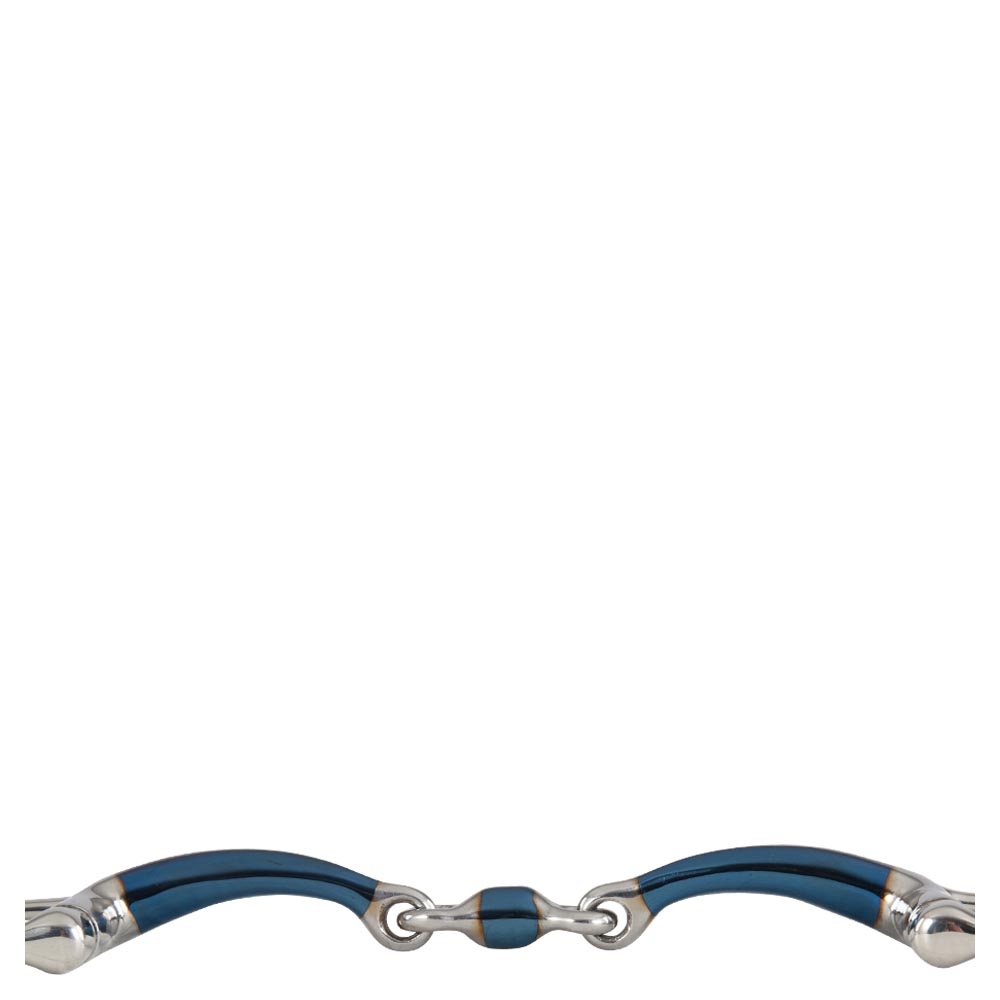 De anatomische vormgeving van het bit zorgt ervoor dat het bit de vorm van de paardenmond volgt en maakt een zachte en gelijkmatige drukverdeling mogelijk. De blauwe kleur van het bit verdwijnt uiteindelijk, maar de smaak van de oppervlakteroest blijft.