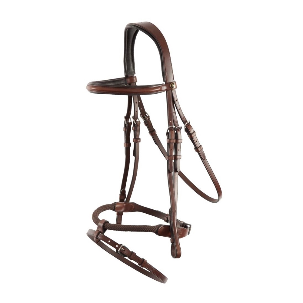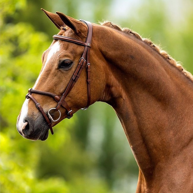 Mooie symmetrische trens met een anatomisch gevormd kopstuk met zachte voering. Recht en plat gevoerd frontriem. De voorkant van de neusriem is gemaakt van nylon touw voor een scherpere correctie wanneer het paard zijn mond opent. De trens heeft ronde, glanzende, zilverkleurige beslag. Wordt geleverd zonder teugels. Verkrijgbaar in kleur: Oak/silver Verkrijgbaar in maat: Cob - Full