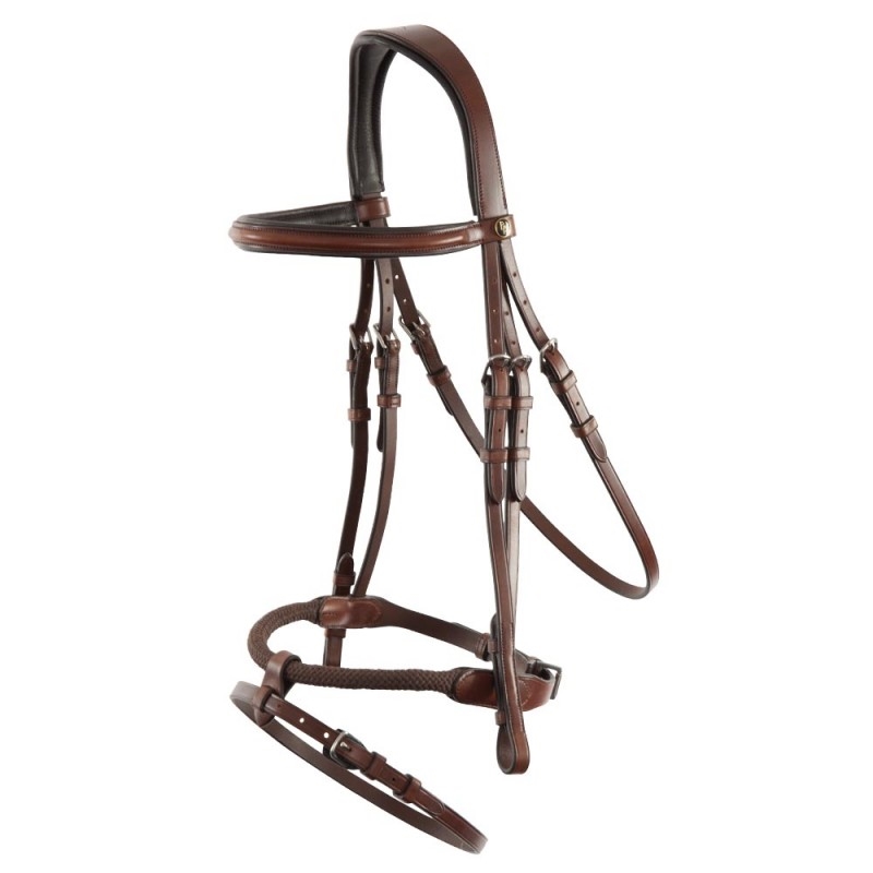 Mooie symmetrische trens met een anatomisch gevormd kopstuk met zachte voering. Recht en plat gevoerd frontriem. De voorkant van de neusriem is gemaakt van nylon touw voor een scherpere correctie wanneer het paard zijn mond opent. De trens heeft ronde, glanzende, zilverkleurige beslag. Wordt geleverd zonder teugels. Verkrijgbaar in kleur: Oak/silver Verkrijgbaar in maat: Cob - Full