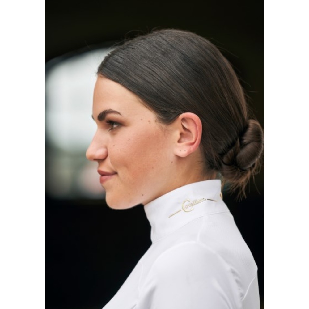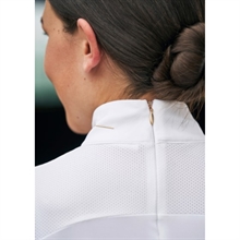 Verborgen ritssluiting bij de kraag aan de achterkant voor optimale pasvorm, mesh inzetstuk bovenaan voor goede ademend vermogen, en prachtige goudkleurige details.