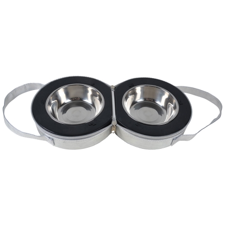 Stijlvolle tas met hondenbakken erin, die praktisch is voor reizen of uitstapjes.