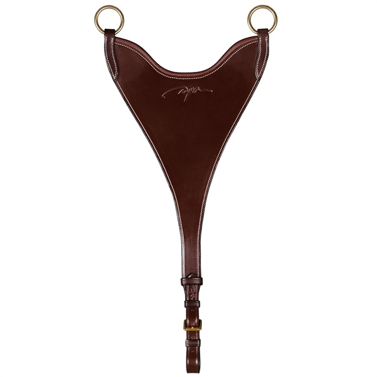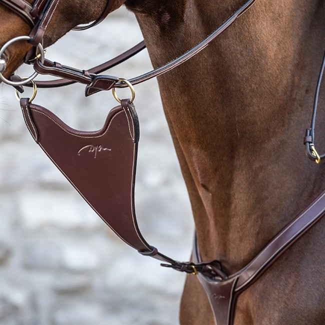Verstelbare korte BIB-martingaal van fijn Spaans leer met messing gespen en witte sierstiksels.