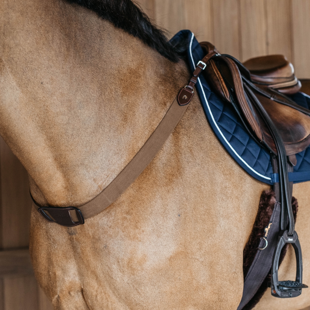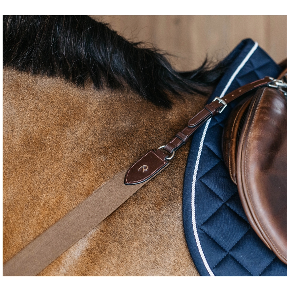 Dyon borsttuig met elastiek is ontworpen om het zadel op zijn plaats te houden terwijl het ultiem comfort biedt voor het paard. Het borsttuig is licht en flexibel, en de borstplaat kan worden aangepast zodat het zelfs bij bredere paarden past. Het is ideaal te combineren met New English Collection, wat zorgt voor bijpassende stiksels en roestvrijstalen gespen. Gemaakt van hoogwaardig Europees leer, dat wordt onderhouden met paraffineolie en glycerinezeep.