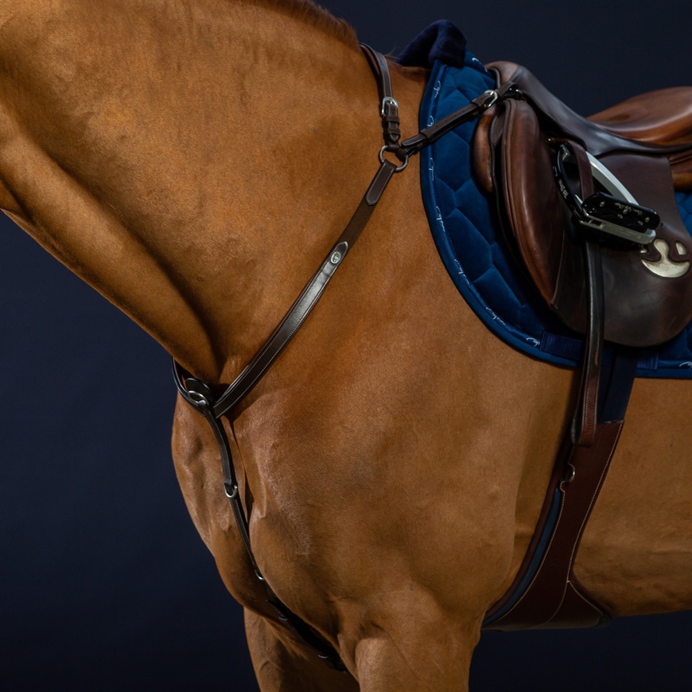 Dyon voortuig van Working Collection is een glad en eenvoudig voortuig dat comfort combineert met klassiek design. Het heeft een verstelbare brug over de schouder en gewatteerde schouderriemen, die het paard bewegingsvrijheid geven en druk verminderen. Gemaakt van buffelleer met elegante zilveren gespen voor duurzaamheid en stijl. Het voortuig kan worden gecombineerd met losse martingaal, die apart verkrijgbaar is.