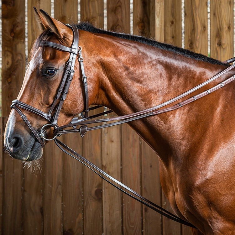 Het glijdtouw wordt geleverd met zowel haken als singelbeslag, zodat je kunt kiezen of het tussen de voorbenen van het paard of aan de zijkanten moet worden bevestigd – perfect voor individueel aangepaste training. De teugel is voorzien van elegante zilverkleurige gespen, die het klassieke en praktische ontwerp compleet maken.