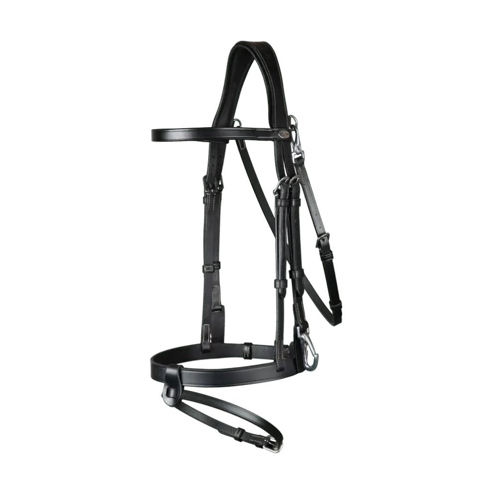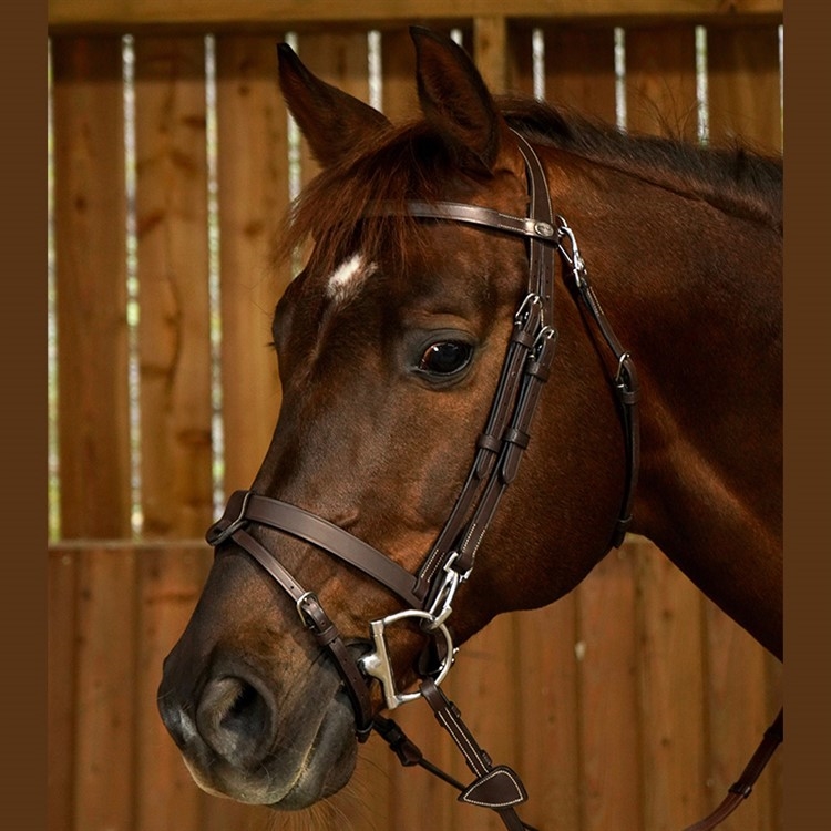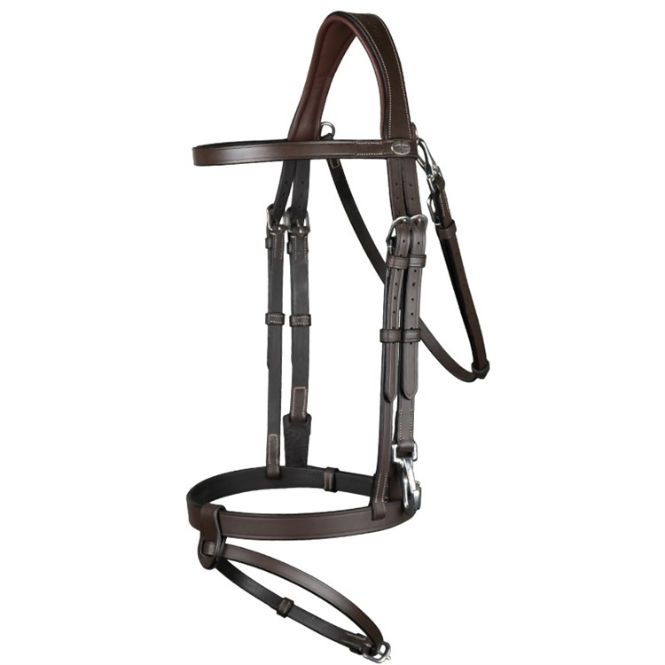 Het hoofdstel is gemaakt van buffelleer met zilverkleurige gespen. Gladde clips voor eenvoudig en snel wisselen van bit. Gladde gecombineerde neusriem, waarbij de onderste neusriem afneembaar is.
