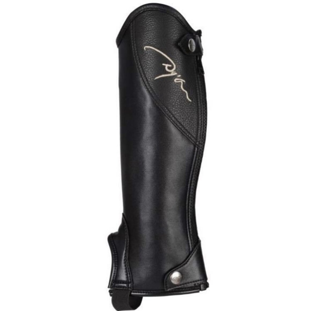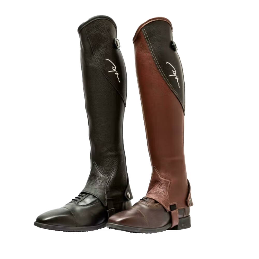 Dyon Original Leggins zijn gemaakt van soepel volnerfleer (2 mm), wat zowel comfort als duurzaamheid garandeert. De leggings hebben een nylon YKK-rits en elastiek achter de kuit voor een perfecte pasvorm. Het unieke ontwerp omvat een elastische band onder de knieholte en een leren band op het elastiek onder de schoenen, die de leggings op hun plaats houden tijdens het rijden. De originele half-chaps-top in druppelvorm is versierd met Dyon-logoborduurwerk in crèmekleurige stiksels voor een elegante afwerking.