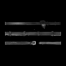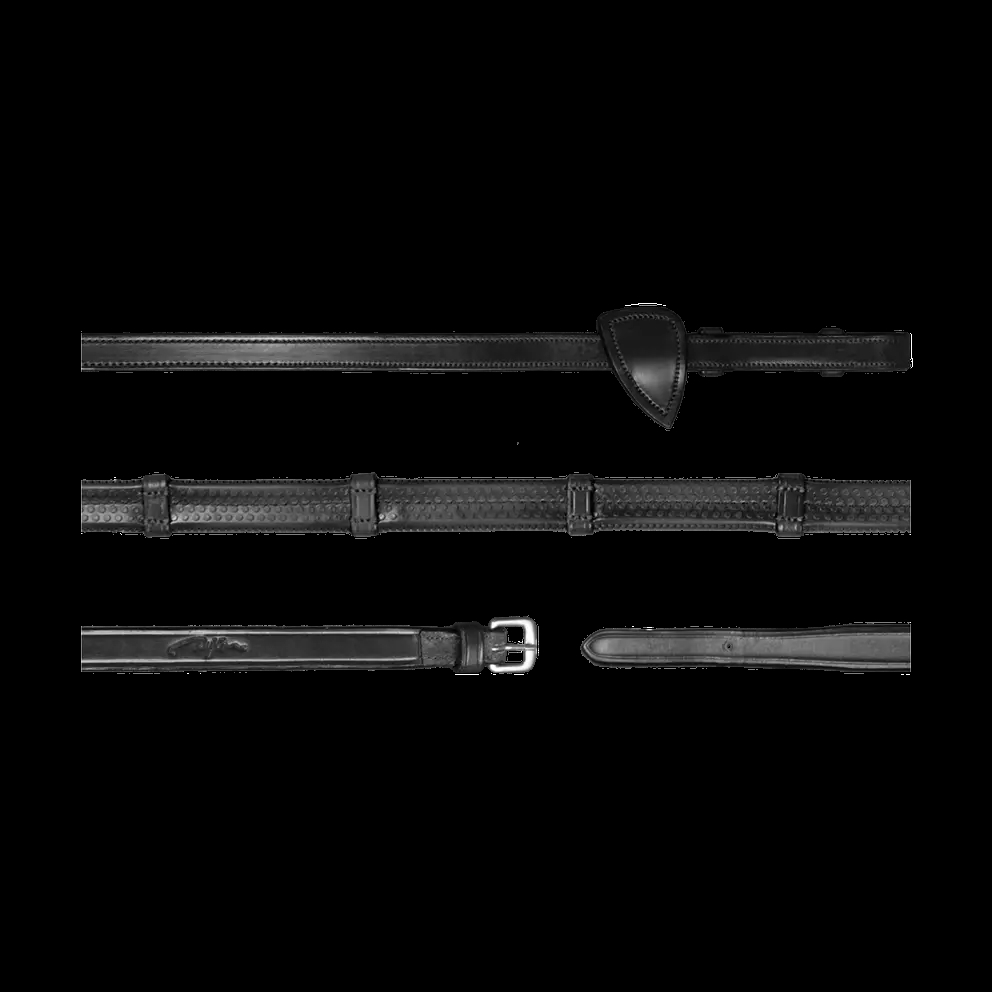 Rubberen teugel met stops in fijn buffelleer met naar binnen gerichte gespen. Zilverkleurige gespen en prachtig ontworpen martingaalstops.