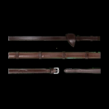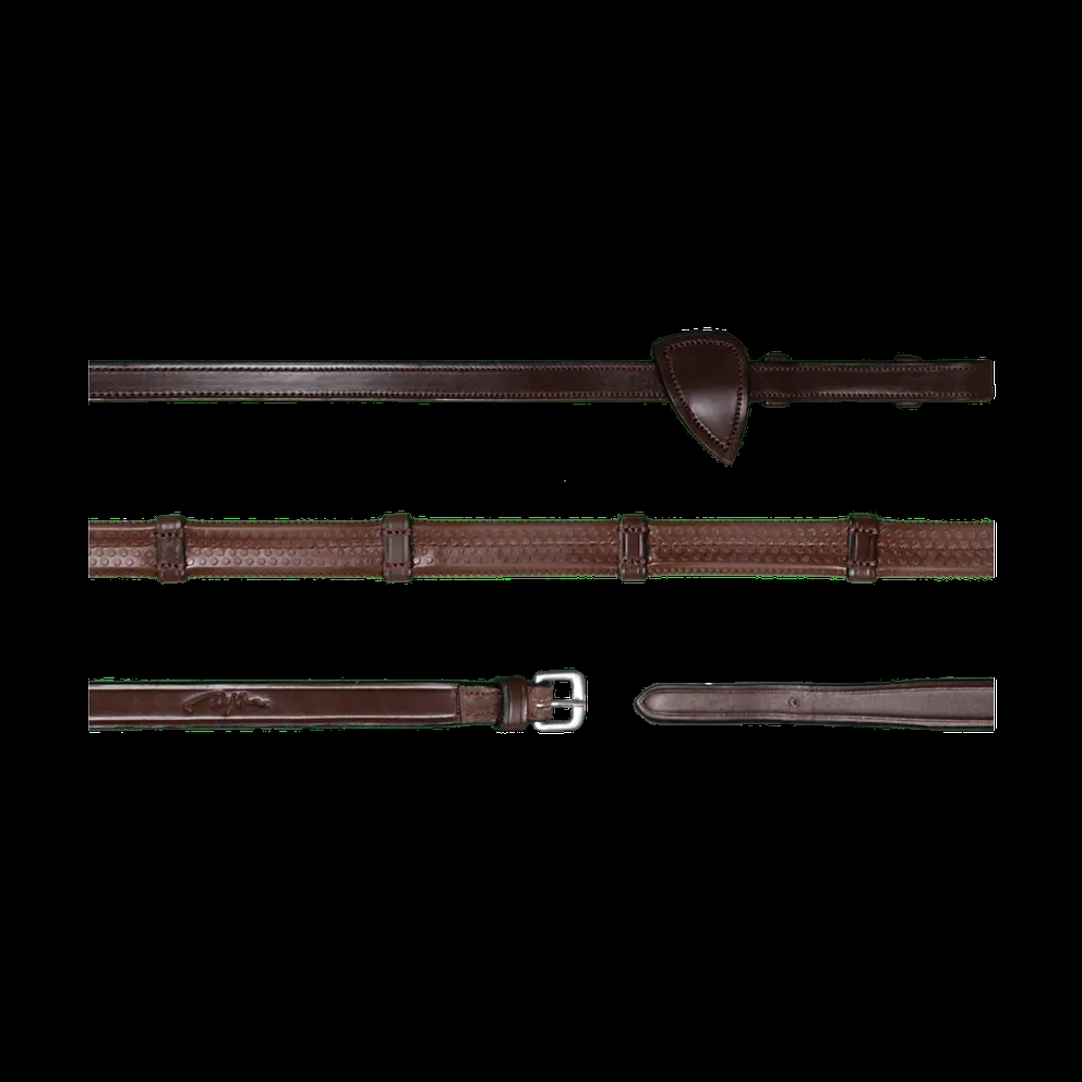 Rubberen teugel met stops in fijn buffelleer met naar binnen gerichte gespen. Zilverkleurige gespen en prachtig ontworpen martingaalstops.