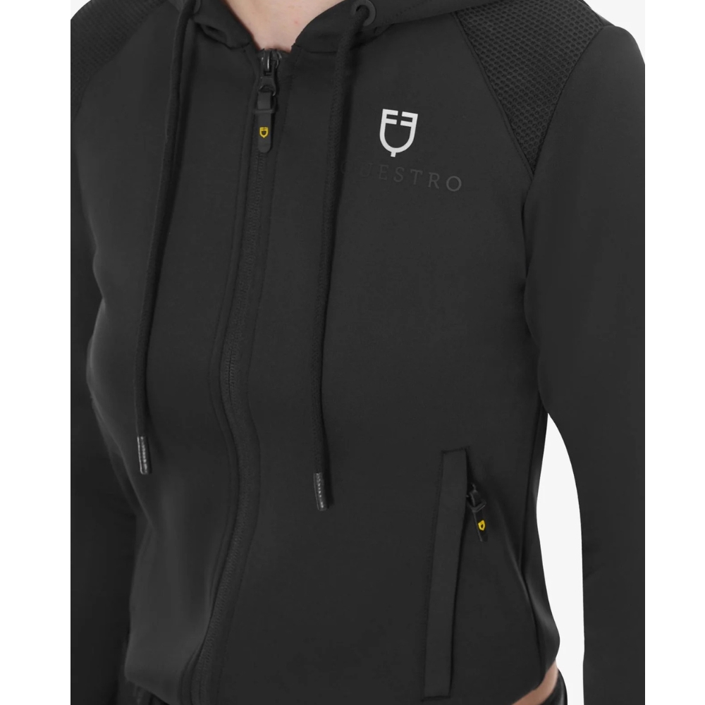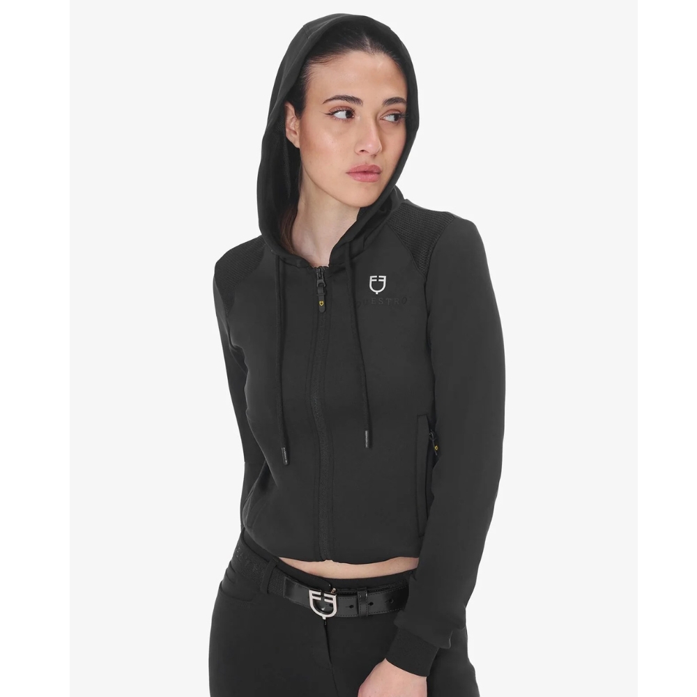 De hoodie heeft een volledige rits, verstelbare capuchon met trekkoord en elastische manchetten en taille voor een perfecte en vrouwelijke pasvorm. De twee voorzakken met rits bieden praktische opbergruimte, terwijl de stijlvolle Equestro-details – logo en letters op de borst en een geperst logo op de rug – de exclusieve look compleet maken.