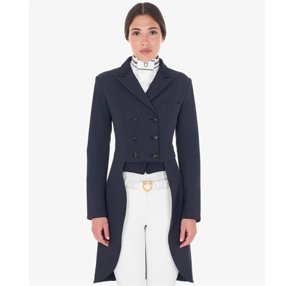 Elegante dressuurjurk voor dames van Equestro, gemaakt van een ademend en bi-elastisch technisch materiaal, dat maximale bewegingsvrijheid en comfort tijdens het rijden garandeert.
