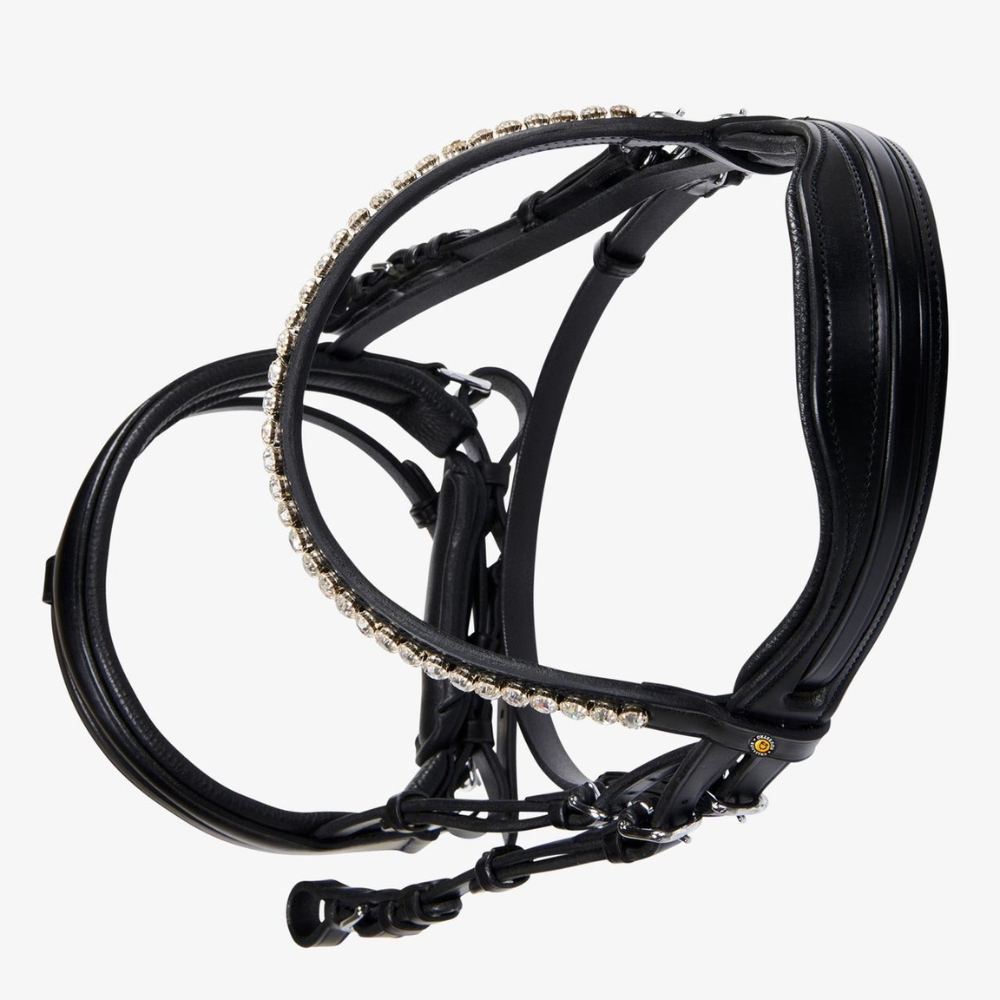 De neusriem heeft een pull-back sluiting, en zowel de neusriem als de kinriem zijn verstelbaar voor een perfecte pasvorm. De frontriem is gepolsterd en versierd met ingelegde glitterstenen en een elegante Equestro metalen logoplaat, wat een exclusieve afwerking geeft.