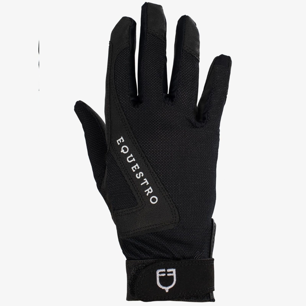 De achterkant en polyestersluiting zijn versierd met Equestro-logo en tekst, wat de handschoenen een sportieve en moderne uitstraling geeft.