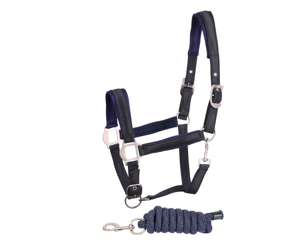 Het halster kan worden versteld bij de neusriem en kaak en heeft zilverkleurige gespen.