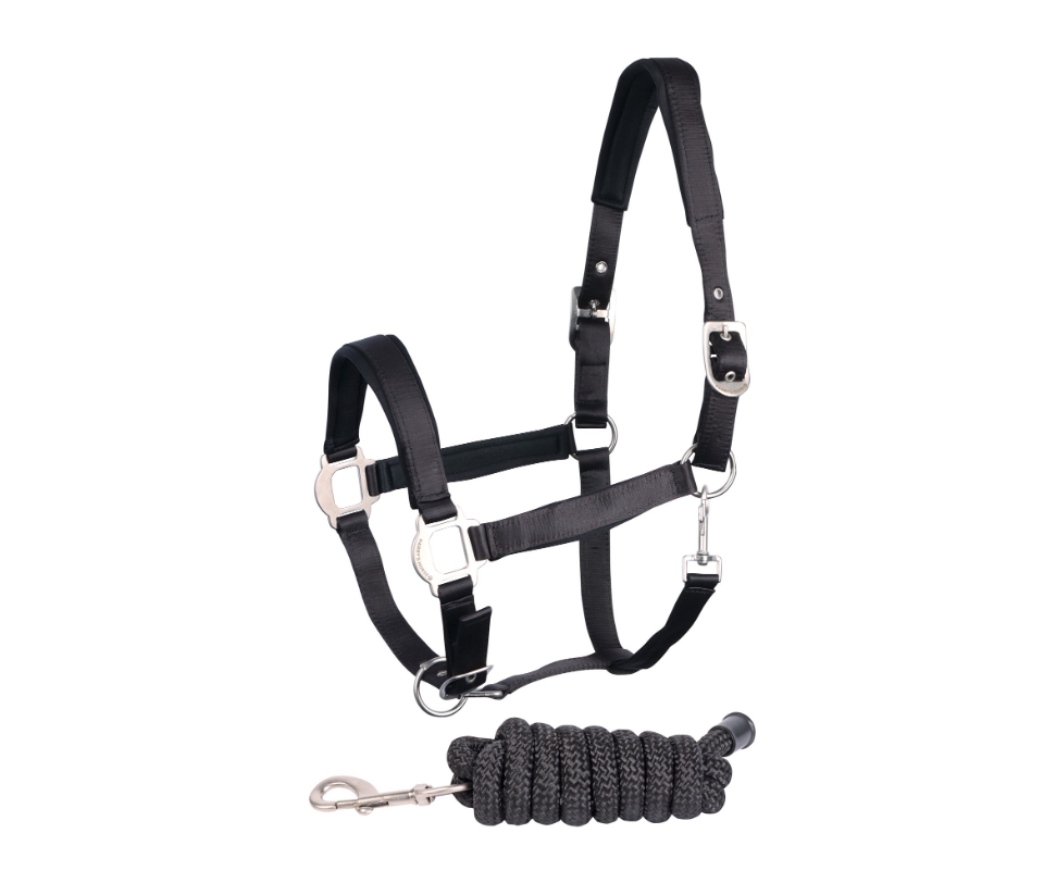 Het halster kan worden versteld bij de neusriem en kaak en heeft zilverkleurige gespen.