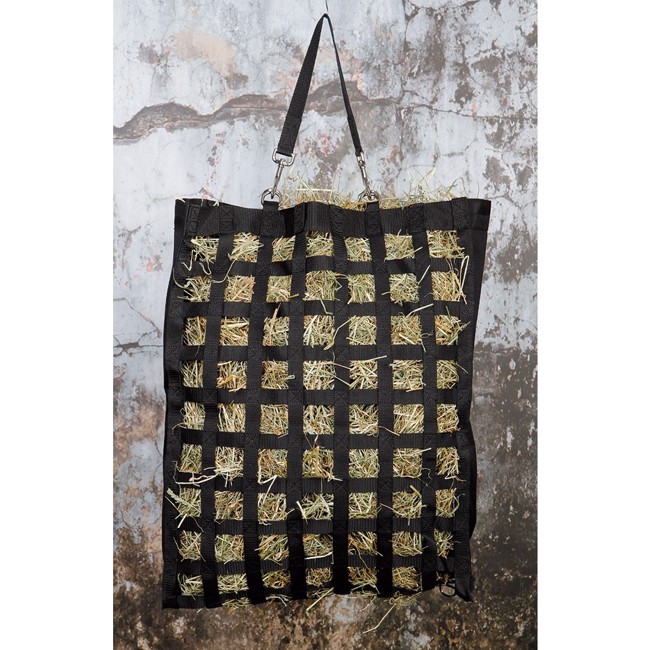 Het hooinet is gemakkelijk op te hangen op de meeste plaatsen met 2 karabijnhaken. De tas is geschikt voor transport. Voor een stationaire oplossing moet men rekening houden met het feit dat de tas niet sterk genoeg is.