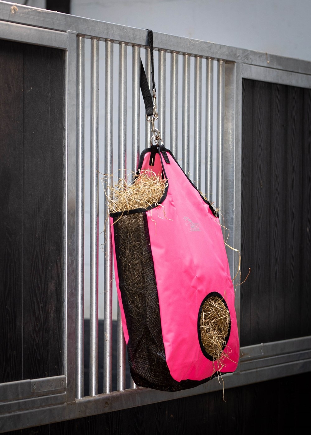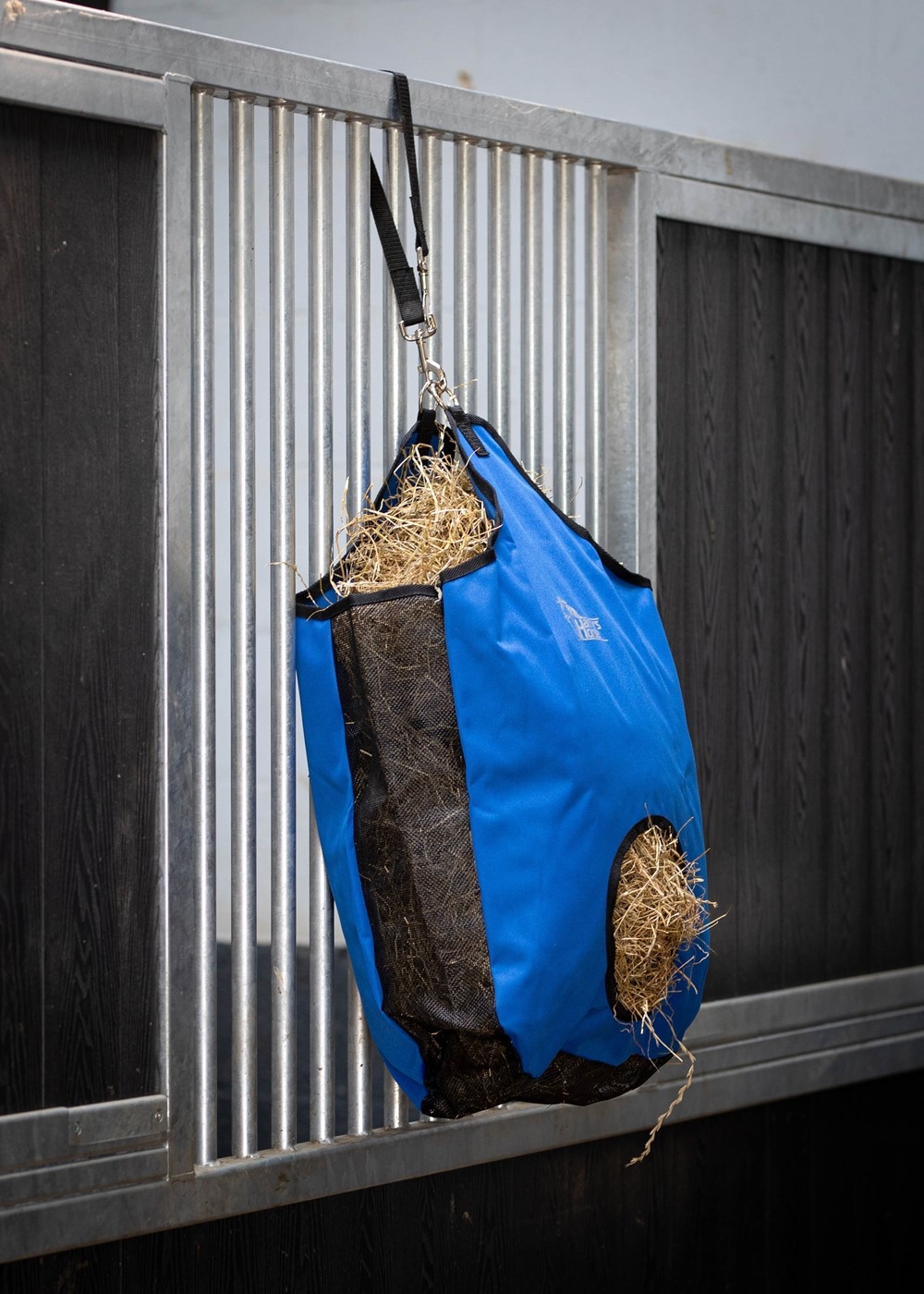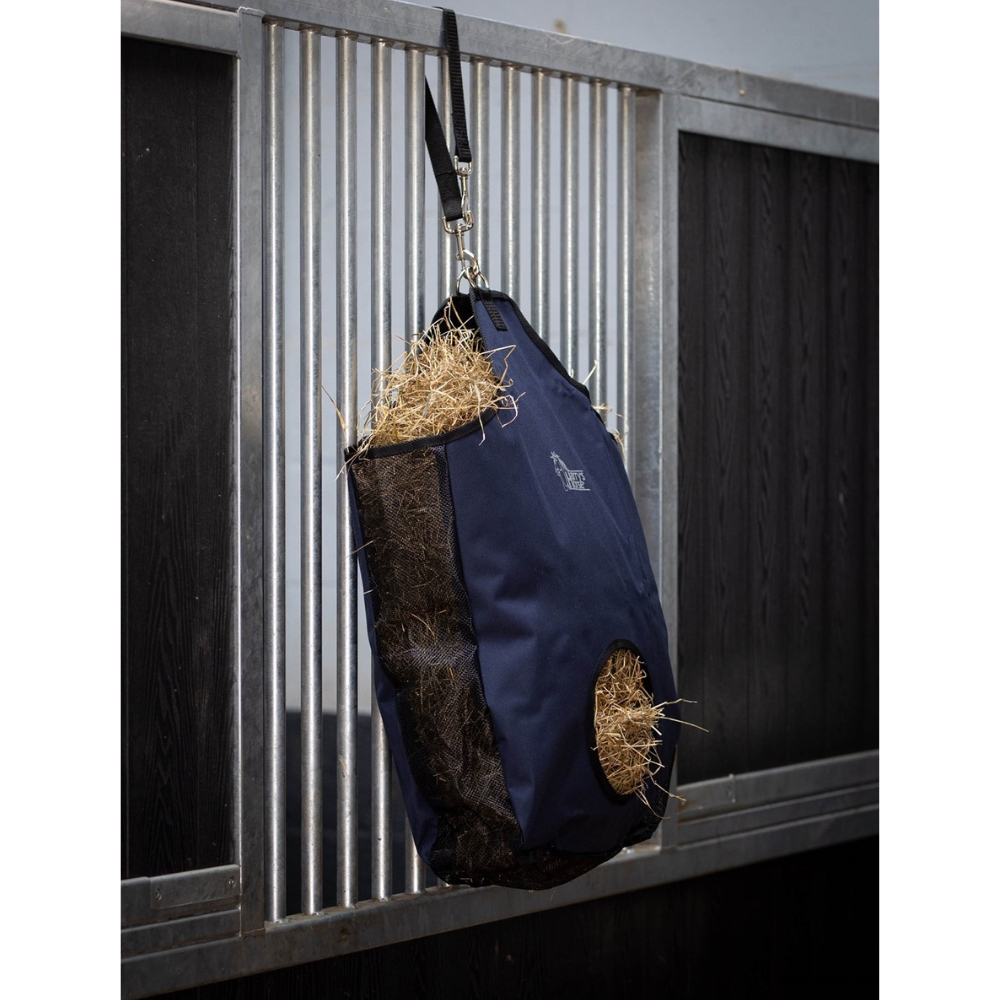 Sterke nylon hooitasje met mesh-inzetstukken aan de zijkanten en onderkant, die het stof uit het hooi filteren.