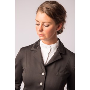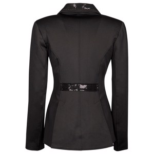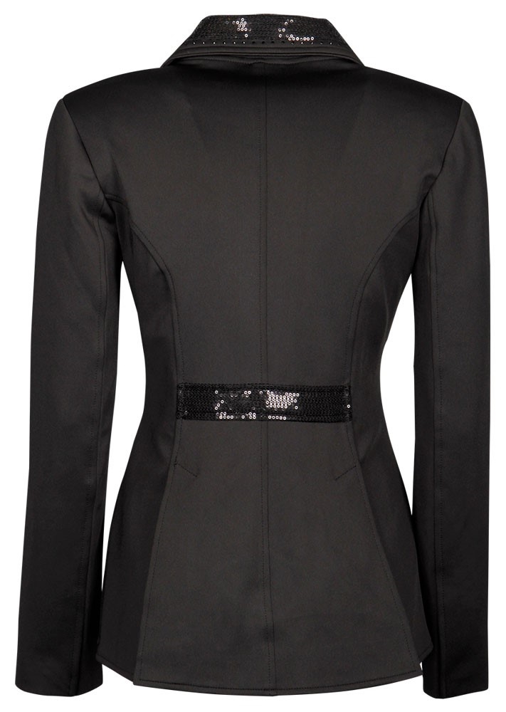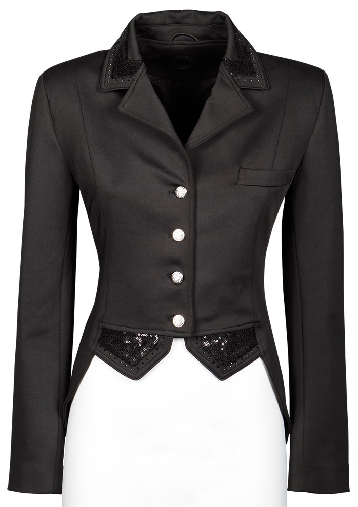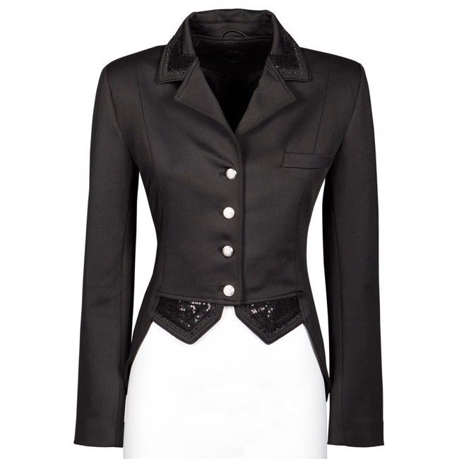 De jas sluit met een rits en knopen met stenen. Kraag, flappen en taille zijn versierd met zwarte pailletten.