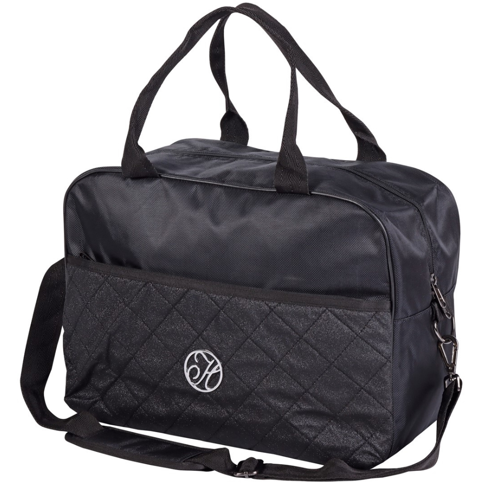 Mooie poetstas in zwart glitter met een groot vak, een voorvak met rits en een afneembare schouderriem.