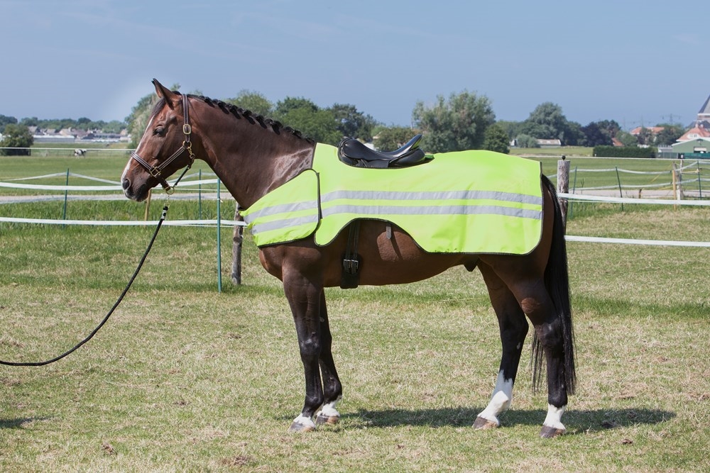 Heerlijke rijddeken met horizontale reflecterende banden in fluorescerend geel, ademend polyester.
