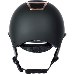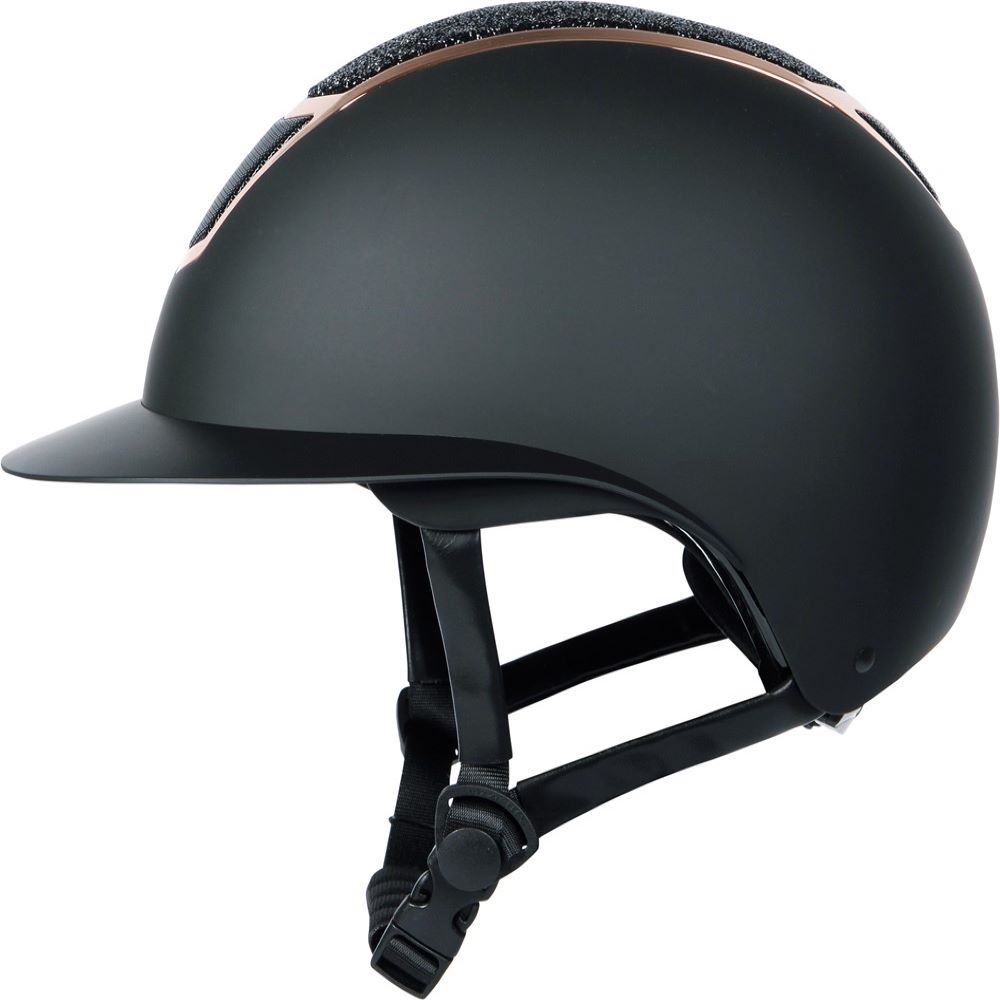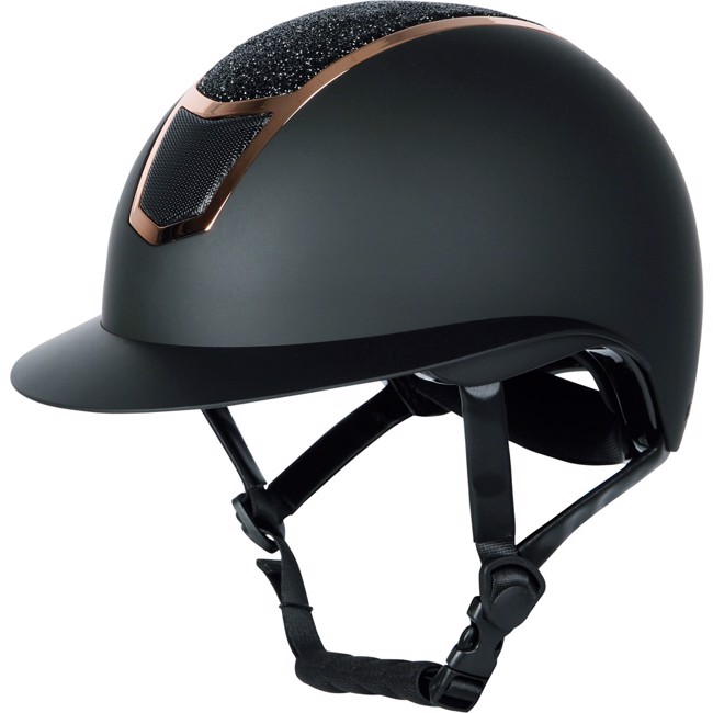Geef je rijoutfit een vleugje elegantie met deze prachtige rijhelm, die een stijlvol ontwerp combineert met maximale functionaliteit. De helm heeft een opvallende glittertop en een brede rand, die zowel een exclusieve uitstraling als extra zonbescherming biedt.