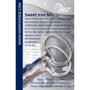 Harry’s Horse Sweet Iron muffebit is een comfortabel en stabiel bit, dat is ontwikkeld om de acceptatie van het bit door het paard te vergroten. Het mondstuk is gemaakt van roestvrij staal gecombineerd met een laag blauw Sweet Iron, dat reageert met vocht en warmte. Deze natuurlijke oxidatie zorgt ervoor dat het oppervlak licht roest en een zoete smaak ontwikkelt, die de speekselproductie stimuleert en het paard het bit beter laat accepteren.