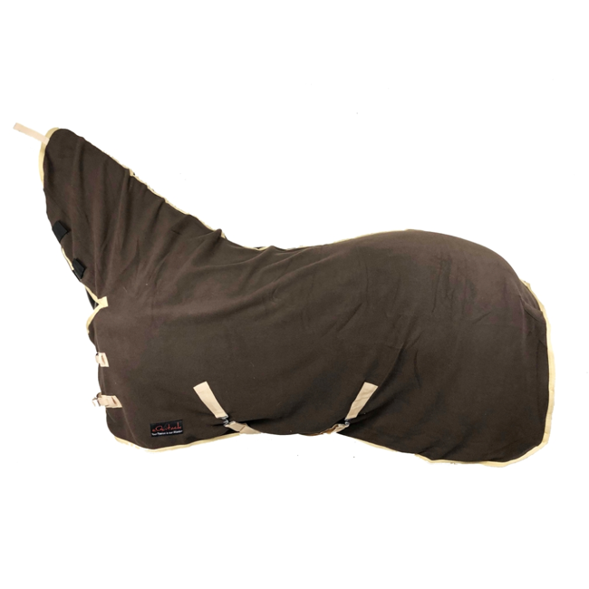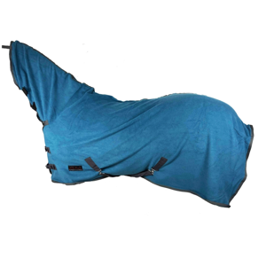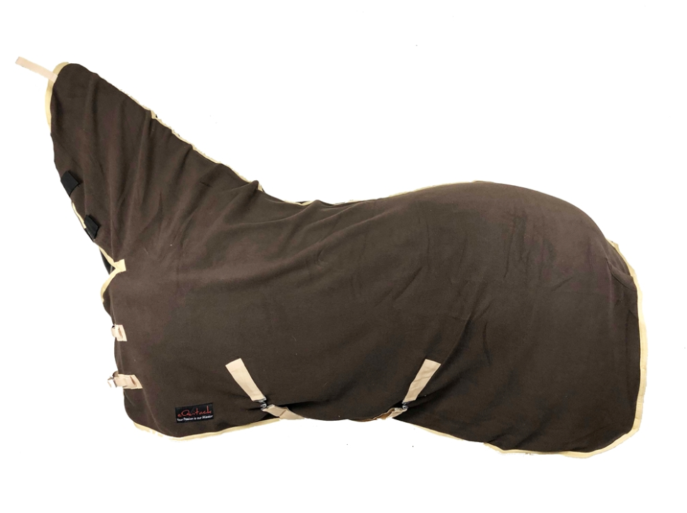 De deken heeft klittenbandsluiting bij de hals en klittenband voor bevestiging aan het halster.