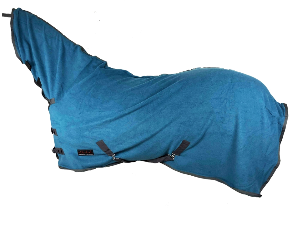 De deken heeft klittenbandsluiting bij de hals en klittenband voor bevestiging aan het halster.