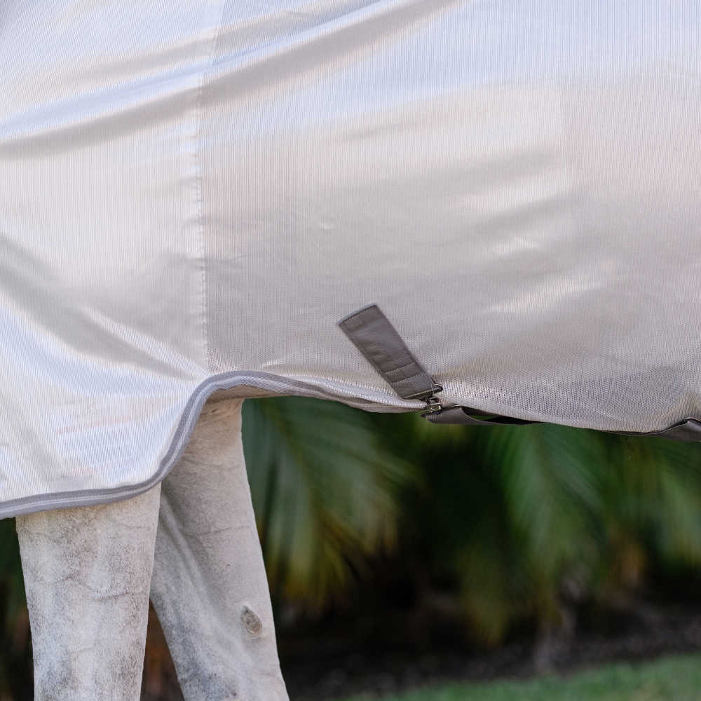 Bescherm je paard effectief tegen vliegen en insecten met deze prachtige en lichte vliegendeken met vaste hals. De deken is gemaakt van zacht, gebreid polyester, dat zowel ademend als comfortabel is – ideaal voor warme zomerdagen.