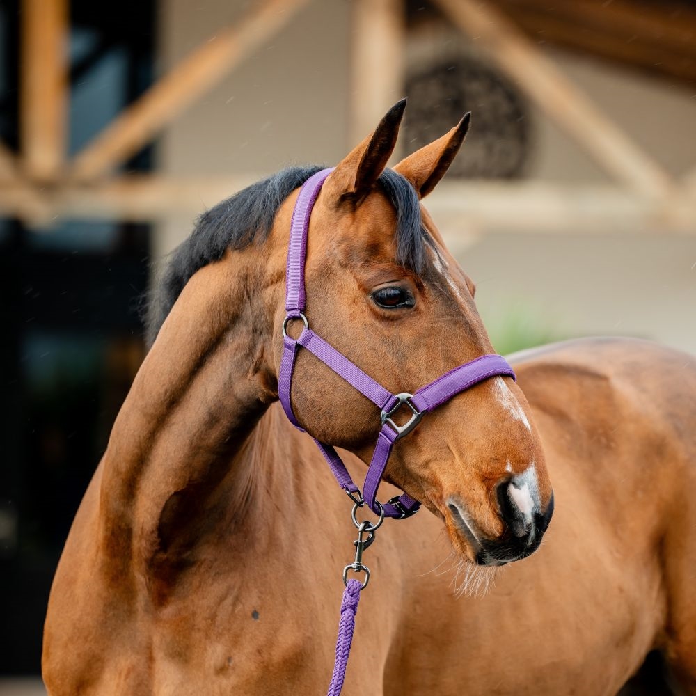 Het halster heeft een verstelbare nekriem, zodat het eenvoudig kan worden aangepast aan het hoofd van het paard en een goede pasvorm biedt. Het meegeleverde halstertouw past bij het halster qua kleur en design en maakt de set zowel praktisch als elegant.