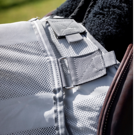 Een praktische en comfortabele vliegendeken, die zomerritten aangenamer maakt voor zowel paard als ruiter.
